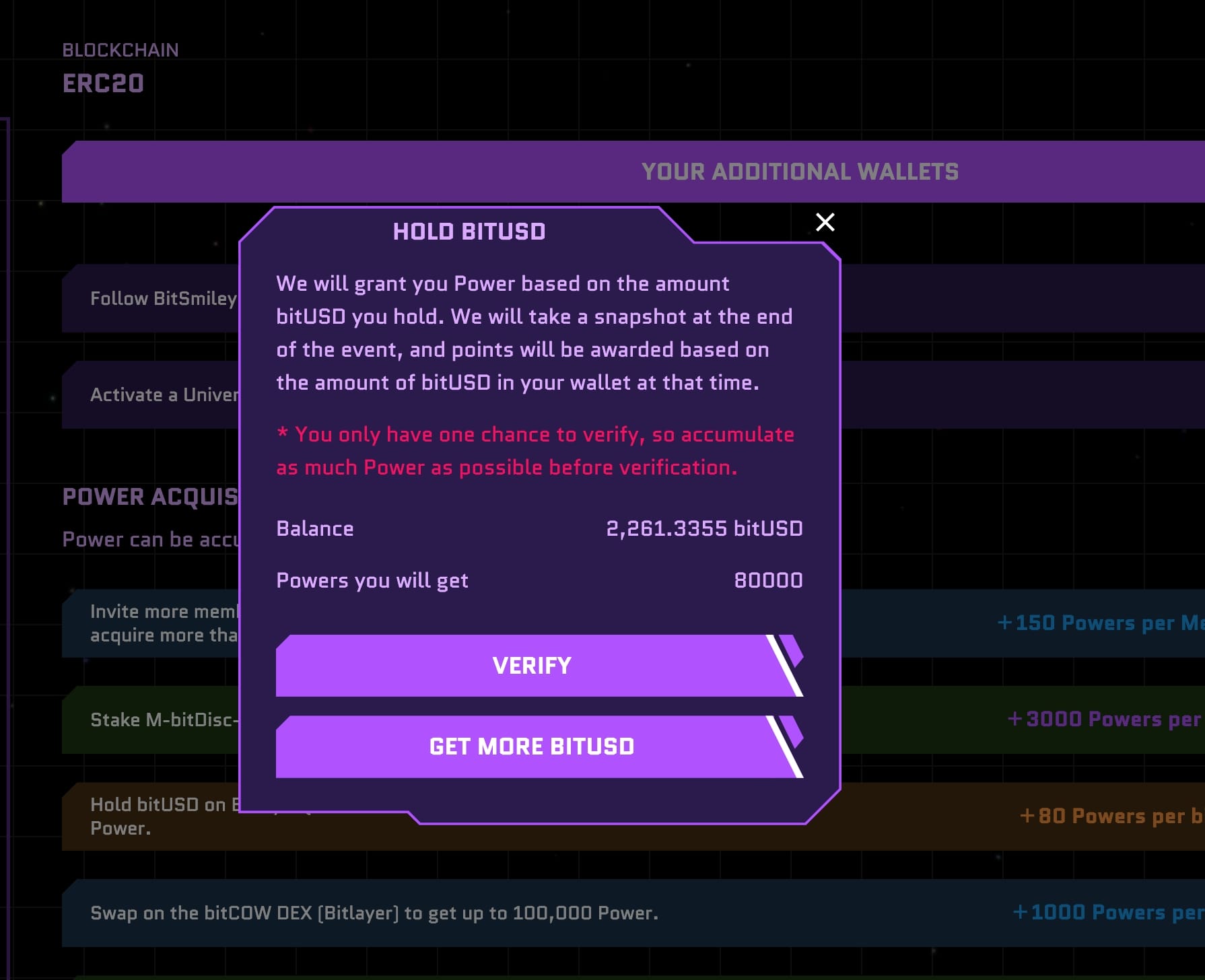 Each unit of bitUSD (recalculated upon a Snapshot) warrants 80 Power for you, limited to 80,000 Power per user.