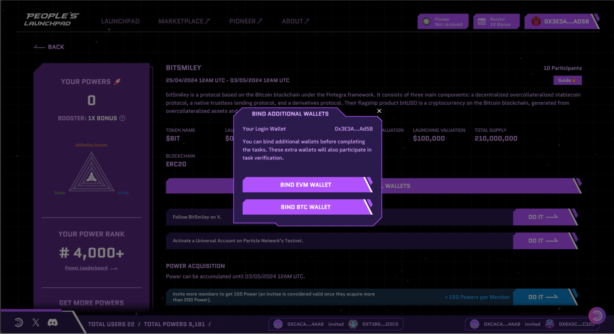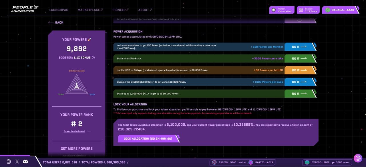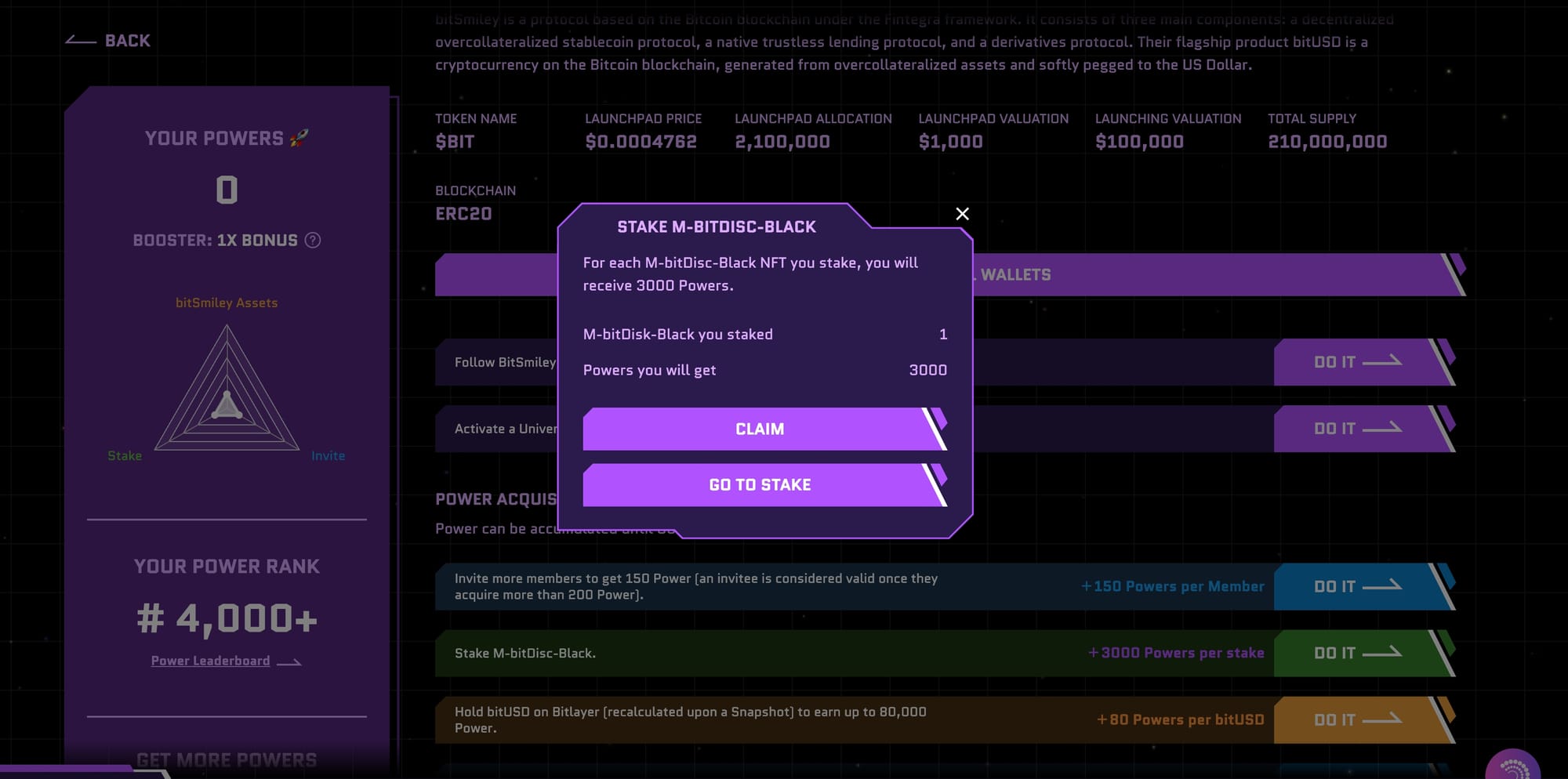 3/ The bitSmiley Launchpad page will now be accessible to you. This page displays your Power ranking (which determines your $BIT allocation) and tasks for you to gain more Power. It also includes key information: your expected $BIT allocation, additional rules on unclaimed purchases, and when you should make your purchase in order to lock in your current distribution.