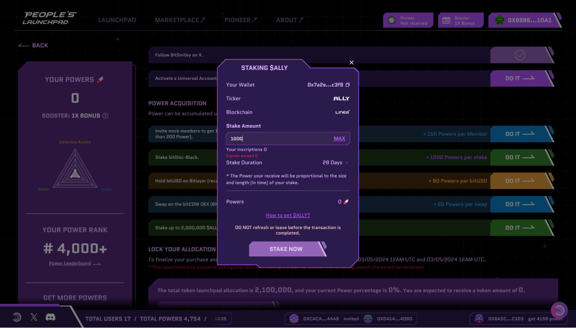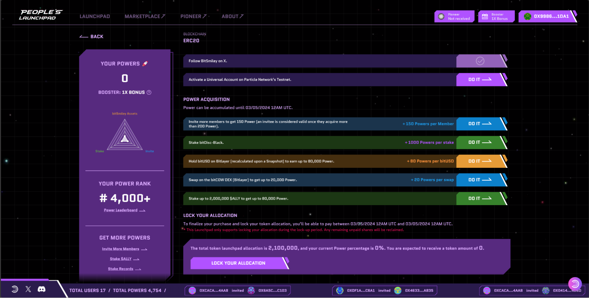 Throughout this opportunity, you’ll also get the opportunity to receive bonuses from participating in Particle Pioneer, dApps, and staking $ALLY, The People’s Alliance’s signature Inscription.