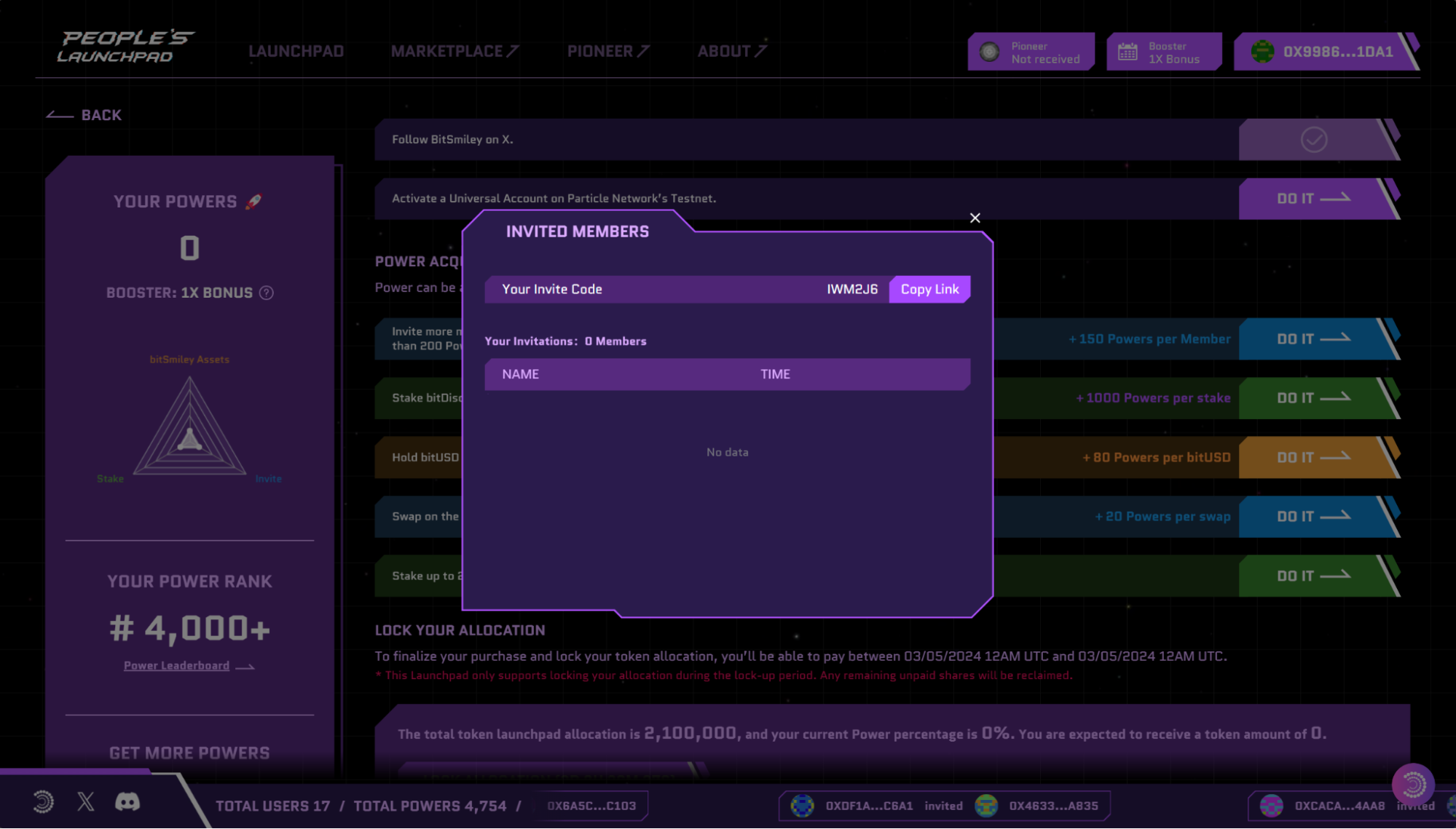 The People’s Alliance is true to its name, and as such rewards you for onboarding your friends. You’ll get 200 extra Power for each user you refer to the platform through your unique invite code provided in the dashboard.
