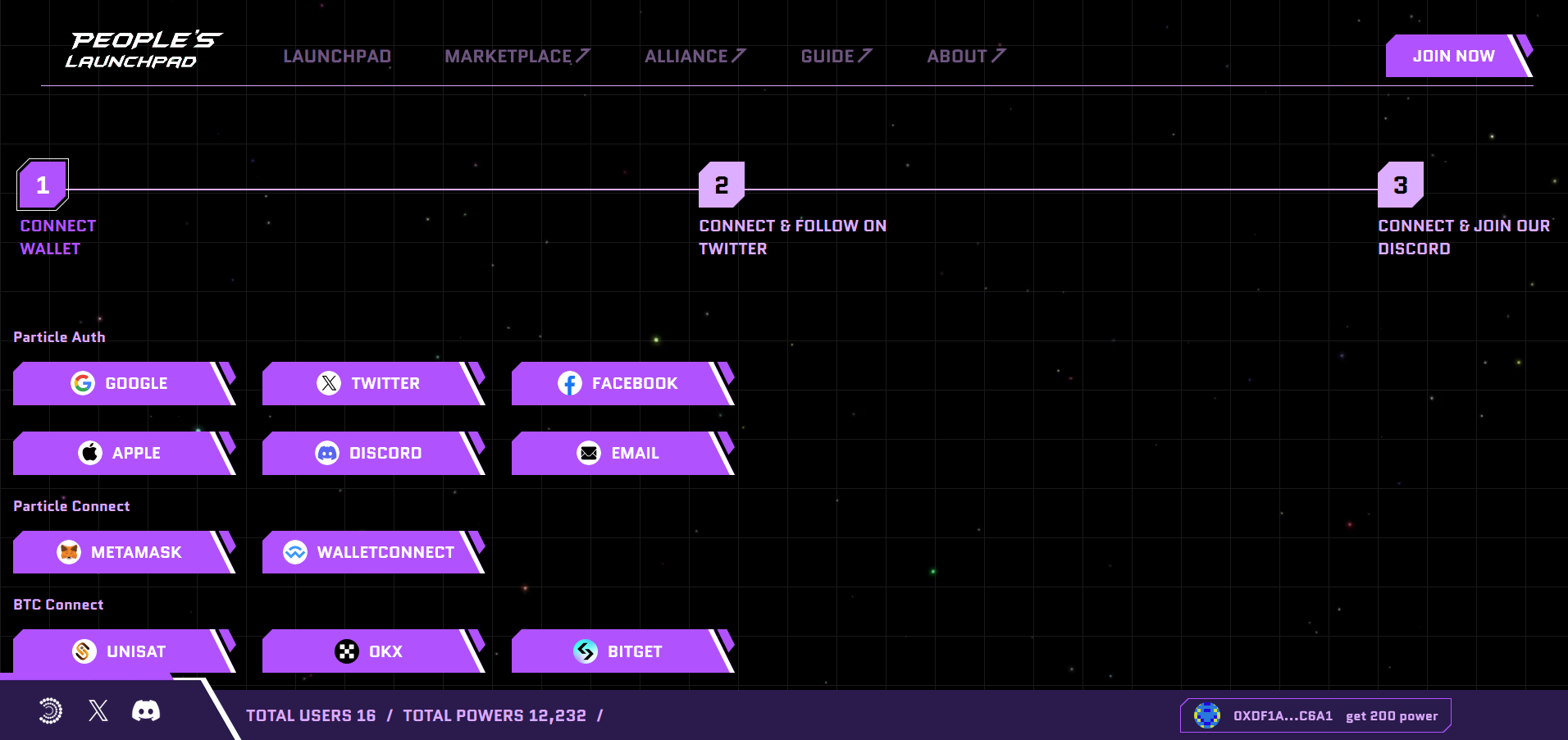 - Click “Join Now”. Select a wallet to connect, and link your Twitter and Discord. In case you’re connecting a Bitcoin wallet, you’ll also eventually bind an ERC-20 compatible wallet such as MetaMask. If you’re logging through social Auth, you may need to connect both additional accounts.
