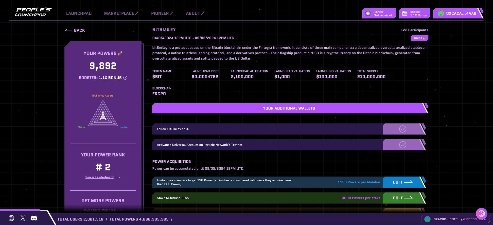Our Launchpad offers you the chance to obtain a $BIT allocation from its pool at a very steep discount. Performing various tasks within the Launchpad earns you Power, which is a measure of your participation and determines your final allocation.