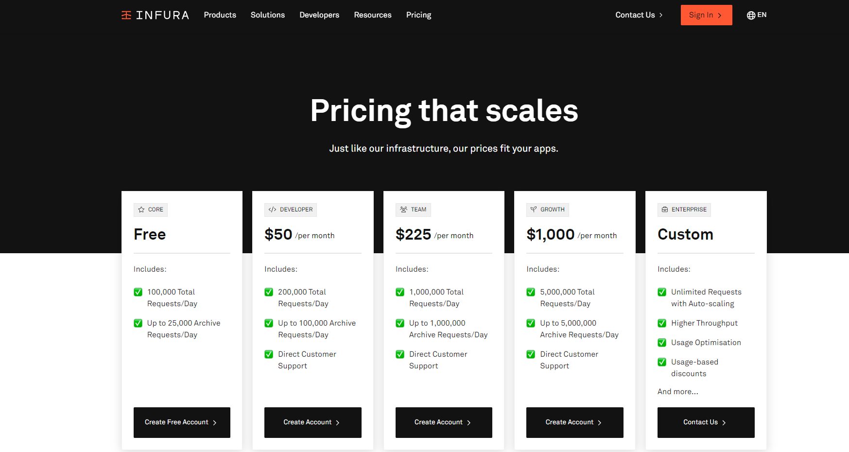 Like Magic, Infura offers a freemium subscription for beginners. However, instead of paying per user, teams can then upgrade to one of the different available packages, each allowing for a higher number of daily API requests.