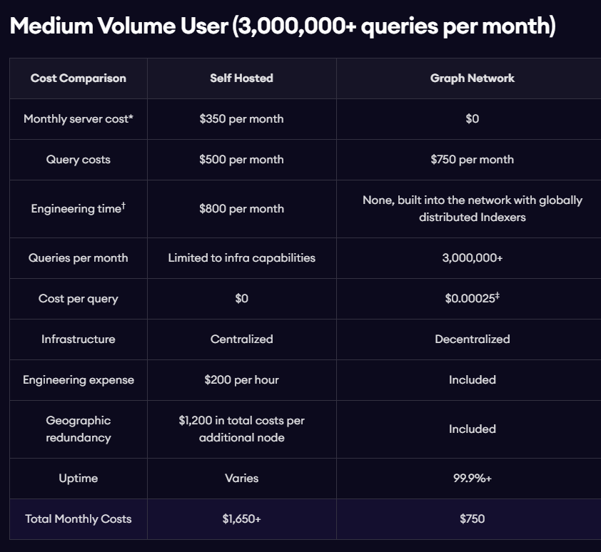 The costs for developers, as indicated by The Graph, are proportional to usage. Developers can choose whether to set up an account where they pre-authorize the system to spend $GRT from their wallet or get it auto-billed in fiat from a credit card. The following is a sample of The Graph’s estimations of their costs: