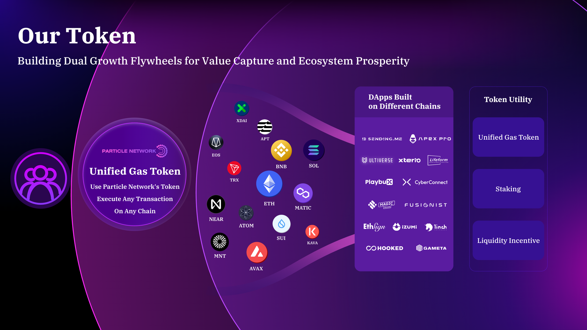 - Token utility: The ecosystem's native token can serve multiple purposes, from facilitating transactions and incentivizing services to granting governance rights. This utility, designed correctly, ensures activity and participation. In Particle Network's case, the primary use case for the native token, as you'll see below, is to facilitate cross-chain transactions.