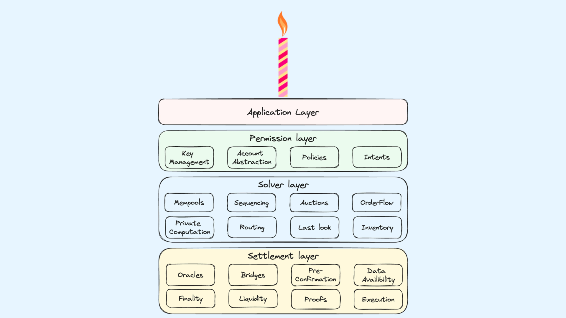 The CAKE framework, developed by Frontier Research, proposes a methodical approach to organizing and unifying chain abstraction solutions. It includes three primary layers: the Permission layer, Solver layer, and Settlement layer.