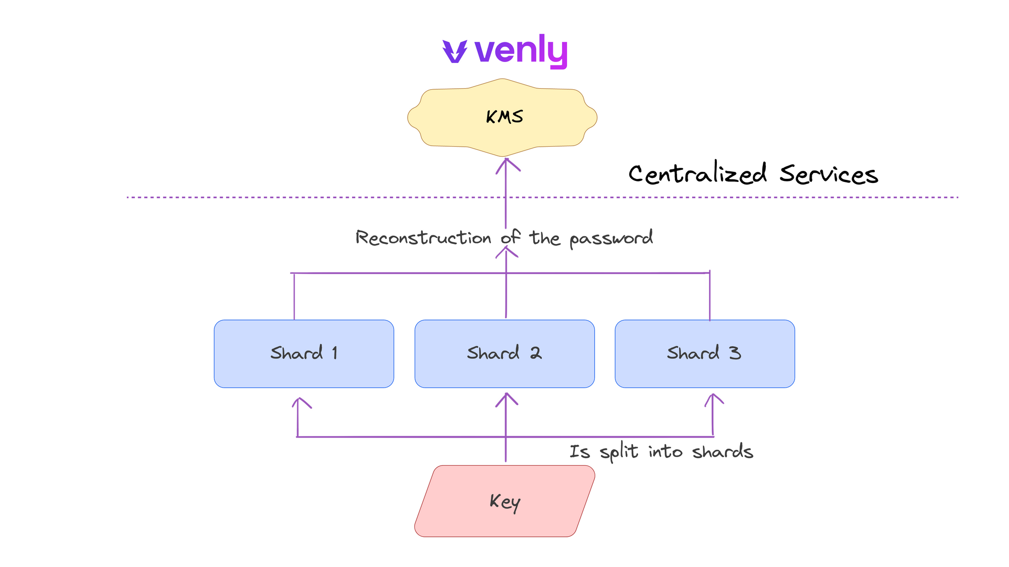 With hybrid solutions, developers need to evaluate the potential complexities caused by the interaction of separate systems. They should also evaluate latency by measuring key retrieval and computation times. One popular solution with this system, Venly, uses MPC-SSS to shard passwords to access the KMS service that stores users’ private keys. Their system is represented below.