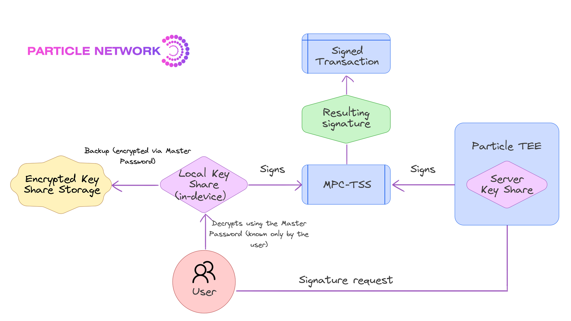 Particle also opens the possibility for the user to create a Master Password to encrypt their local key fragment, which can then be stored safely. This makes users’ wallets accessible across devices with full security. The system's robustness is also reinforced by a continuous key share refresh mechanism, enhancing security and making an attack virtually impossible.