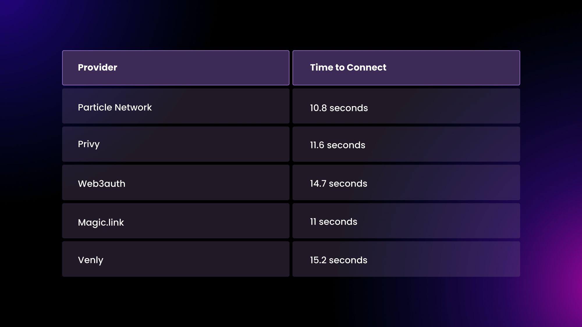 While integrating an embedded wallet service, it’s important to understand that different providers might perform differently in different areas. Two key areas to analyze are the time to generate a wallet (from the time a user clicks “Connect” to the wallet being usable), as well as the time for repeating users to log in. These performance metrics can be impacted by the underlying management systems of each solution.