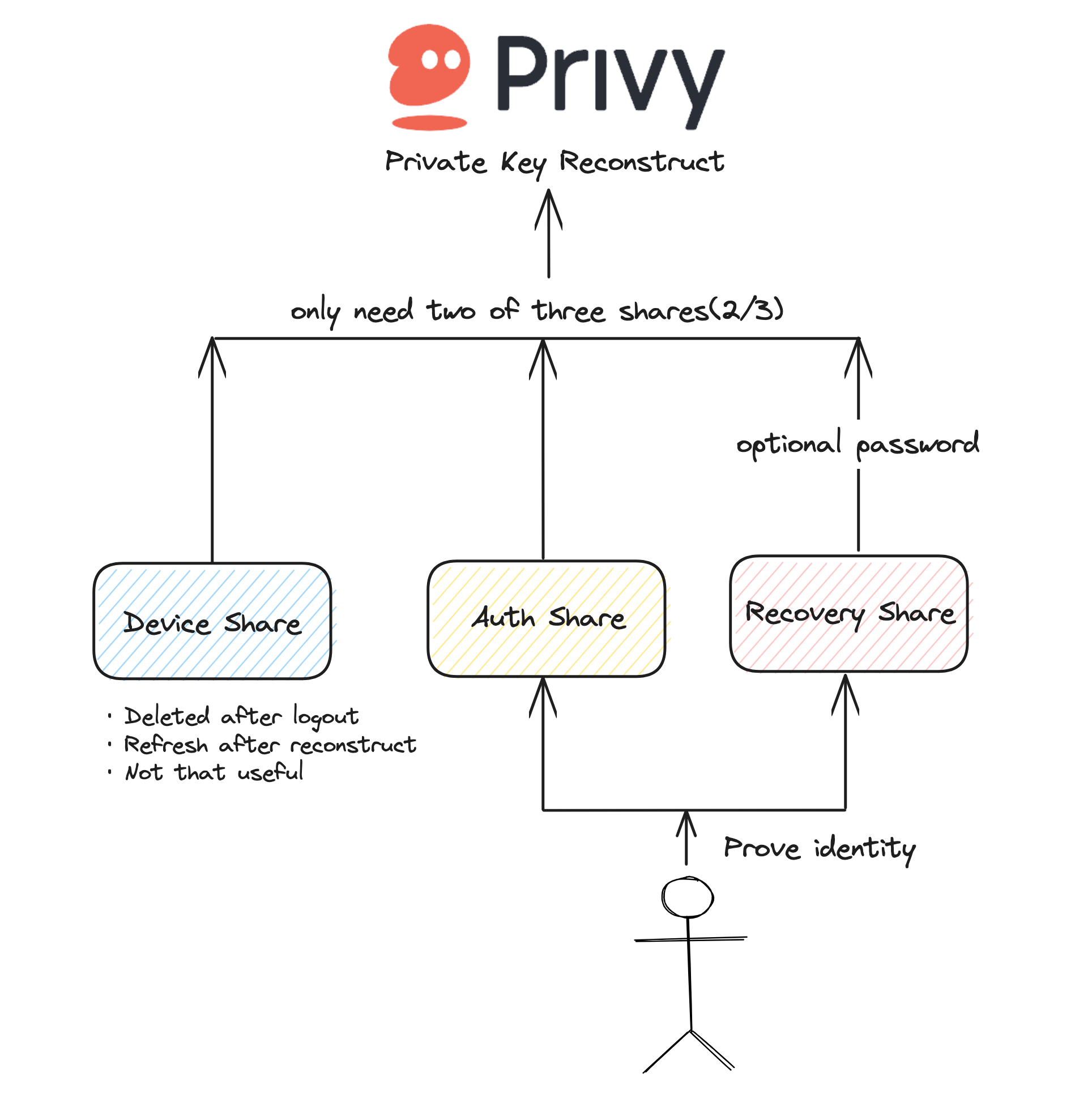 One popular service using MPC-SSS is Privy, which offers embedded wallets that are hardware-secured, self-custodial, and managed via an isolated iframe that handles wallet operations. Privy only stores private keys in-memory, minimizing exposure. This means that private keys are never exposed to either Privy or the integrating applications, making the solution fully non-custodial (although these keys are still re-constructed during usage and creation).