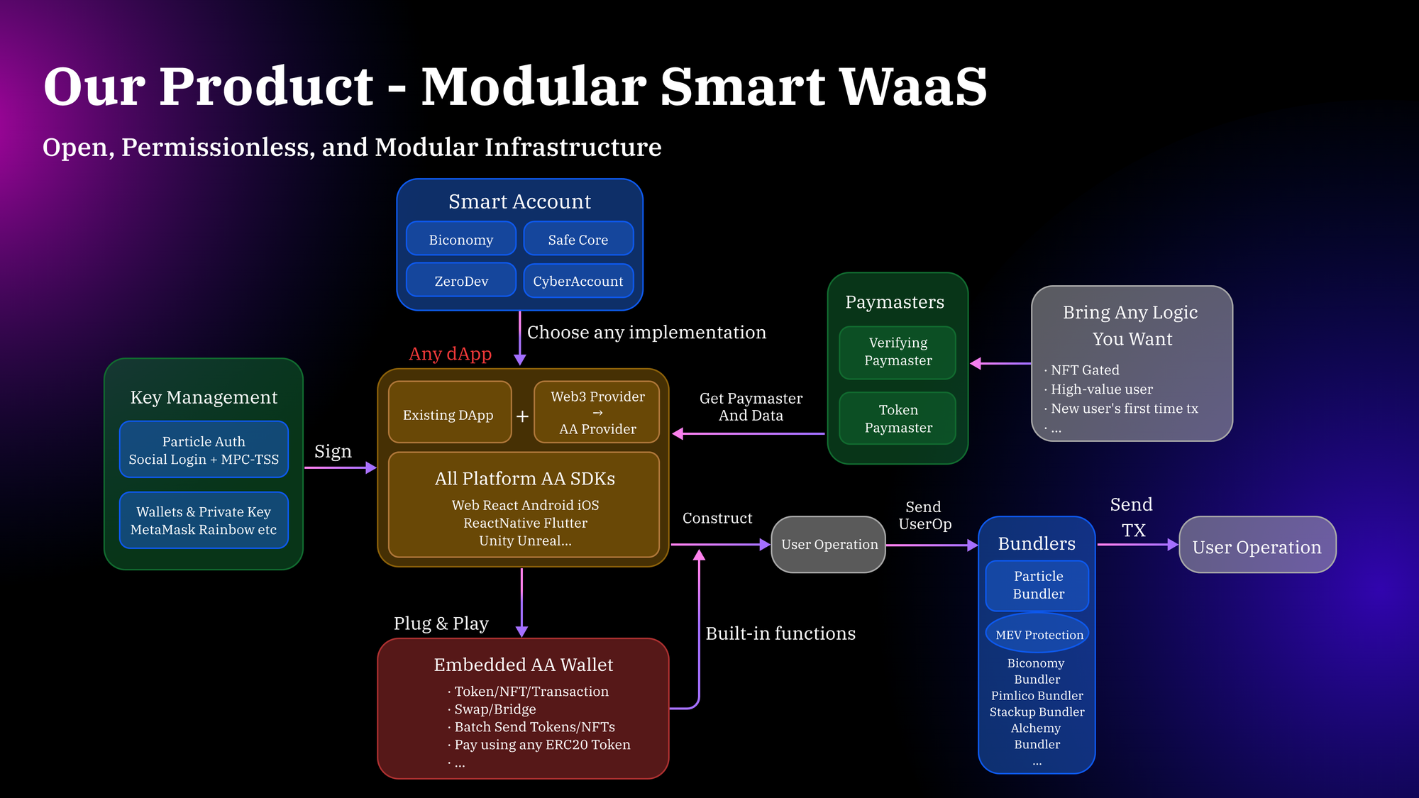 Particle Network has a vertically integrated solution, offering a self-developed WaaS and AA stack, integrating AA directly into its WaaS offering. Particle also supports the usage of Biconomy’s AA stack while also providing cross-compatibility with Openfort, Pimlico, Alchemy, and others, which can be found in our product documentation. Via AA support, WaaS providers can turn the current rigid wallet experience into a more flexible one through programmability, making the user experience smoother.