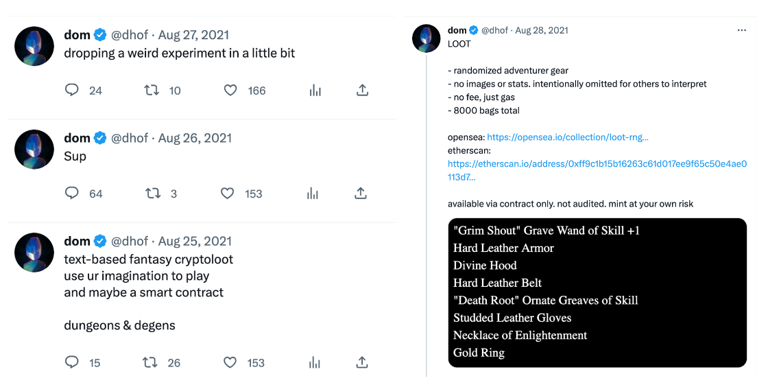 Meanwhile, Loot (for Adventurers), launched in August 2021, also introduced its own new paradigm for FOCGs. It completely abstracted the visual and gameplay layers typical to games and NFT collections, bootstrapping a bottom-to-top community-centric model for users to build value and narratives around it.