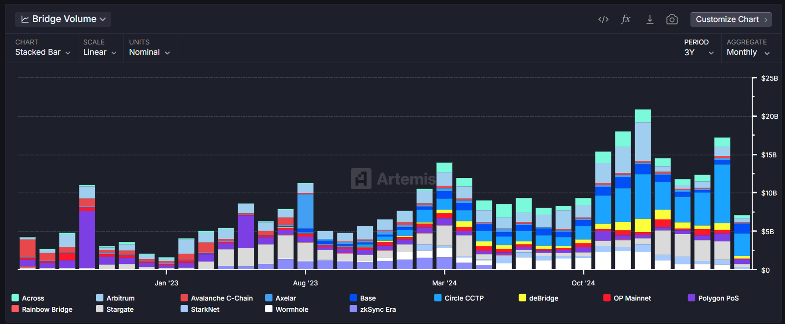 - The concentration of bridging volume across 3-6 bridges at any given time, suggesting their usage solely to adapt to market conditions/opportunities amidst fragmentation. In other words, money flows where money is—and will easily and quickly flock anywhere.
