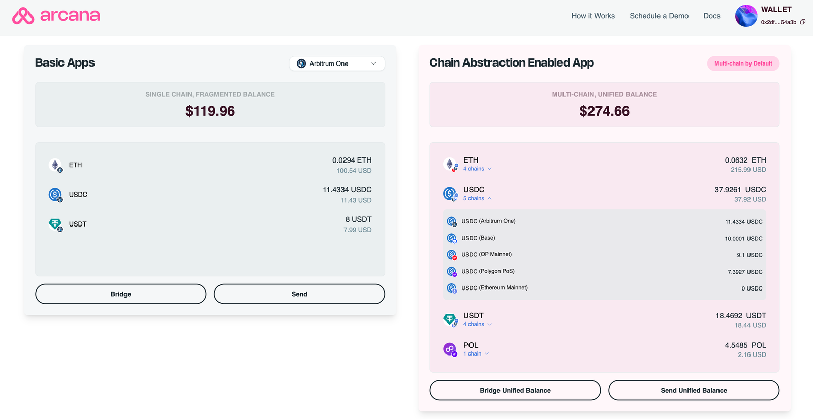 Arcana has recently deployed Arcana Auth v2 and rolled out its embedded Chain-Abstracted Wallet SDK. This SDK demonstrates that ChA can be embedded invisibly within Web 2-style onboarding flows. It also features a polished design showcasing the combination of users’ assets across chains.