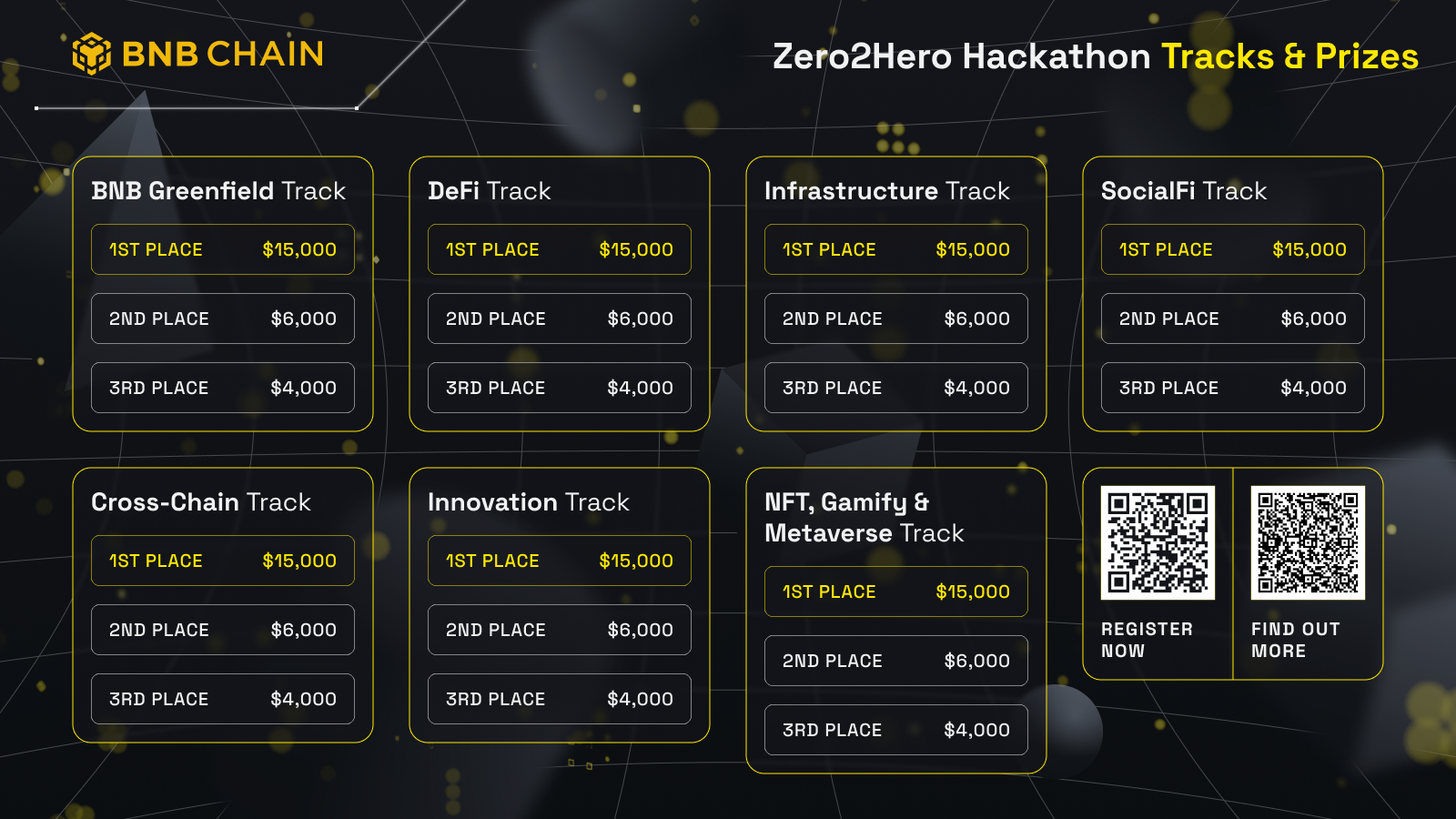 The Zero2Hero Hackathon brings together blockchain professionals and developers from around the world to collaborate on projects and solutions that will help advance the blockchain industry. The hackathon features seven tracks: DeFi, Infra & Scalability, SocialFi, Cross-chain, NFT, Gamify & Metaverse, Greenfield, and Innovation. Participants will compete for cash prizes of $15k for 1st place, $6k for 2nd place, and $4k for 3rd place in each track. The 1st place winner in each track will also be granted a ticket to the incubator program, which offers additional exposure, technical skills, Web3 marketing, tokenomics design, community building, and more.