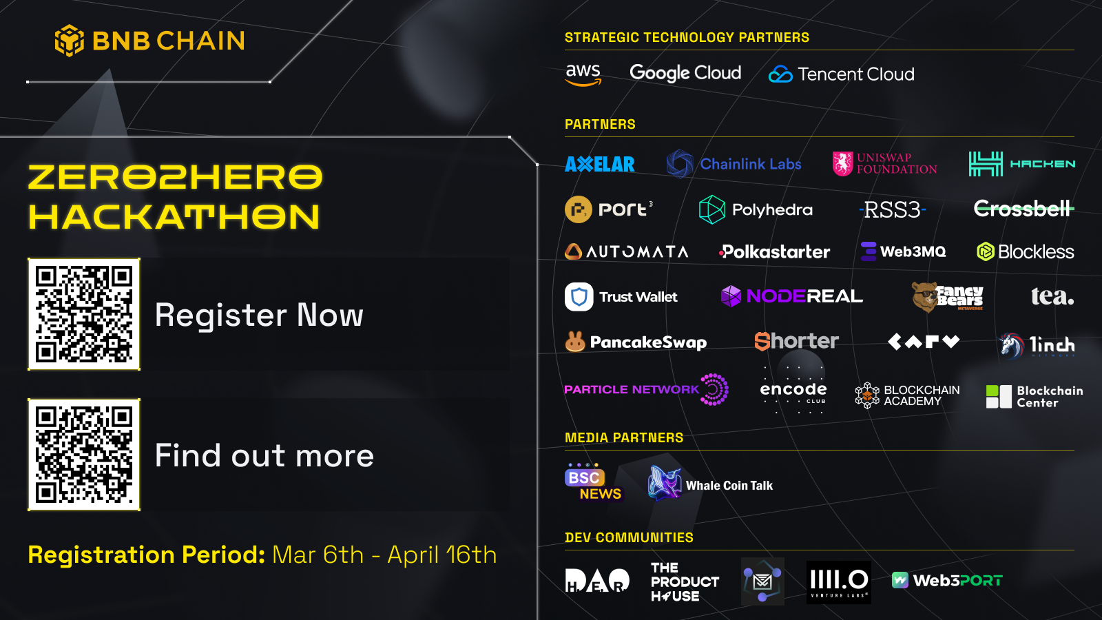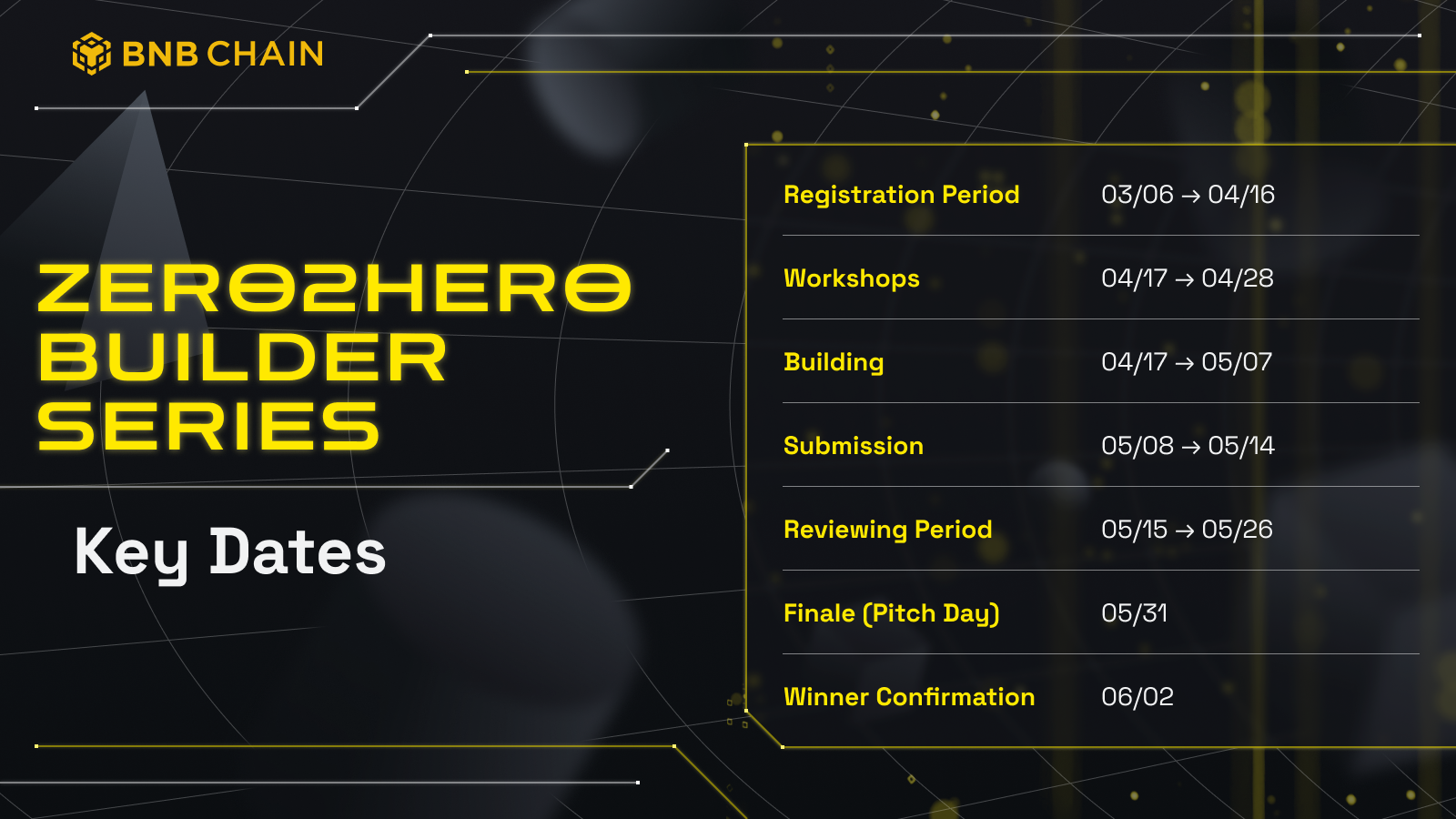 We invite developers around the world to join us and bring your innovative ideas to life. Learn more about the BNB Chain Zero2Hero builder series and sign up for the Hackathon today!