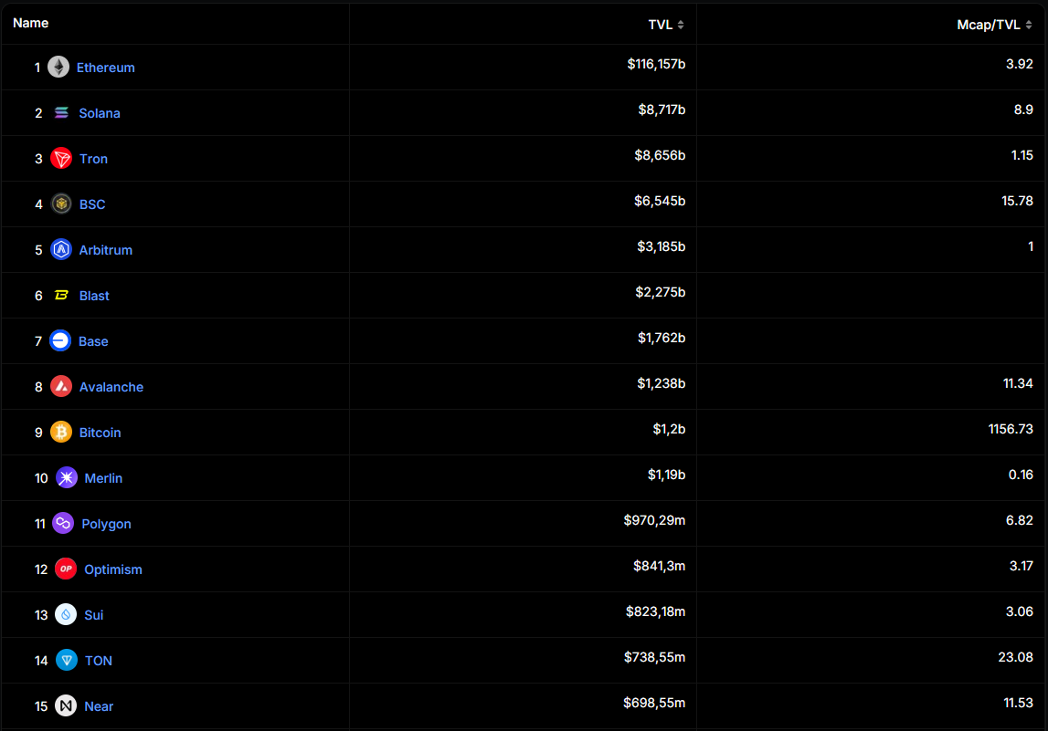 While the chart above offers us a wide range of MC/TVL ratios, it can be immediately interpreted that some chains (e.g. Arbitrum) are very actively used for their ecosystem of dApps, while others (such as TON, and BSC), although they tend to be perceived as high-value as chains, don’t have high ecosystem adoption.