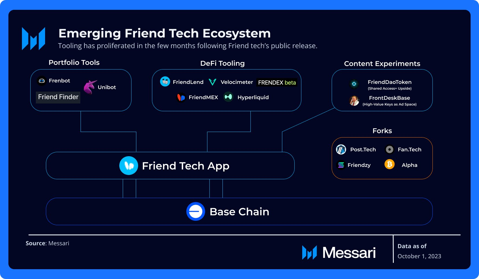 - The importance of composability in Web3. Inspired by Friend.tech’s success, a market of applications built on top of it quickly developed, allowing users to trade keys, collectively hold them, create their own versions of the dApp, lend them, and much more. Composability is an often-cited benefit of Web3 that hadn’t ever reached its full potential within SocialFi, and the Friend.tech ecosystem quickly showcased that, with a successful app, developers’ creativity can quickly spark growing innovation. As SocialFi evolve, developers might want to have this in mind in order to build applications that are inherently suited to spark their own ecosystems, and possibly release them simultaneously to achieve greater outcomes.