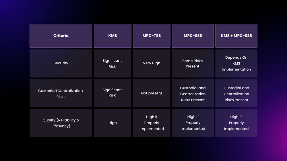The below chart compares different private key management mechanisms commonly used in WaaS tools: