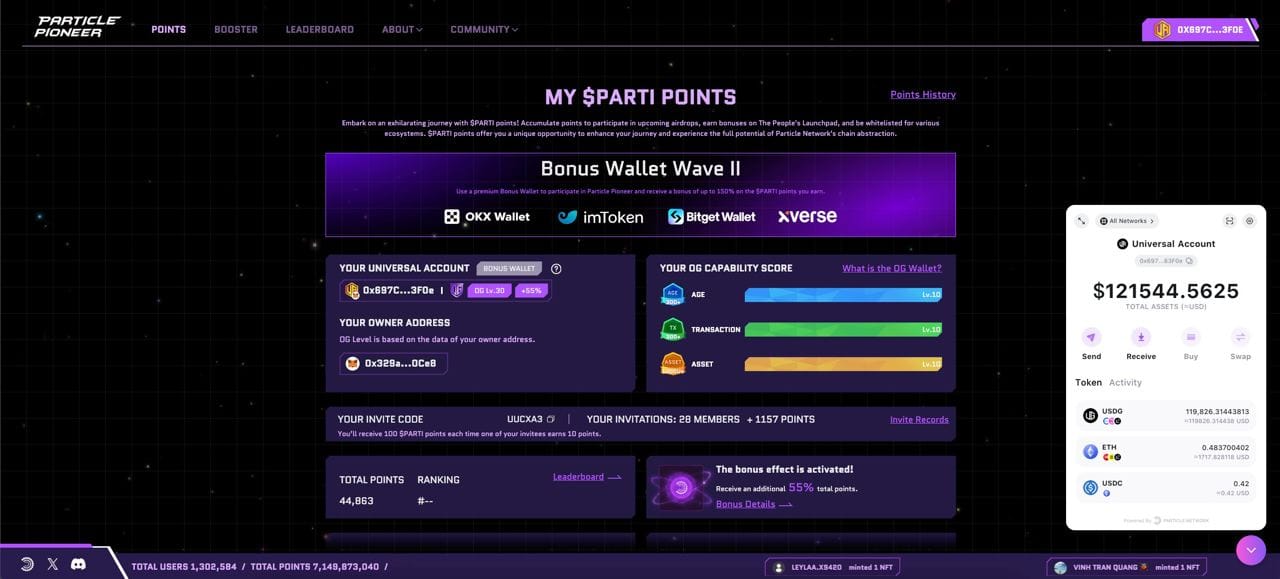 In this phase, now available on Particle Pioneer, you will be able to use your Universal Account to seamlessly send cross-chain transactions, as well as leverage Universal Liquidity to utilize your token balance across all chains. You will also continue to earn $PARTI points as in Testnet Phase 1, increasing your future rewards from Particle Network and bonuses on The People’s Launchpad.