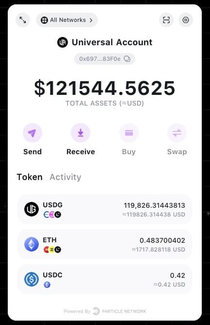 - Click the “Open Wallet” button or the Particle Network logo on the bottom right corner to show your Universal Account.