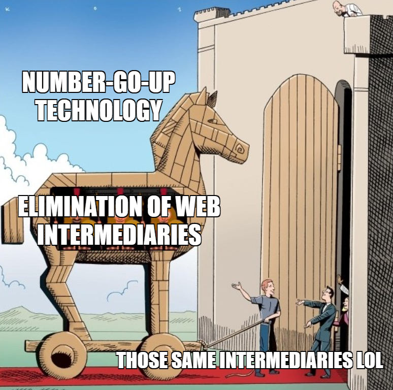In other words, the financial/speculative component of blockchains has been the main vehicle driving the sustainability and promotion of decentralized, permissionless, intermediary-less technology.