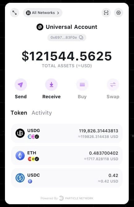 - Embedded within a dApp integrating UAs. This is similar to how Universal Accounts can be accessed currently via the Particle Pioneer platform.