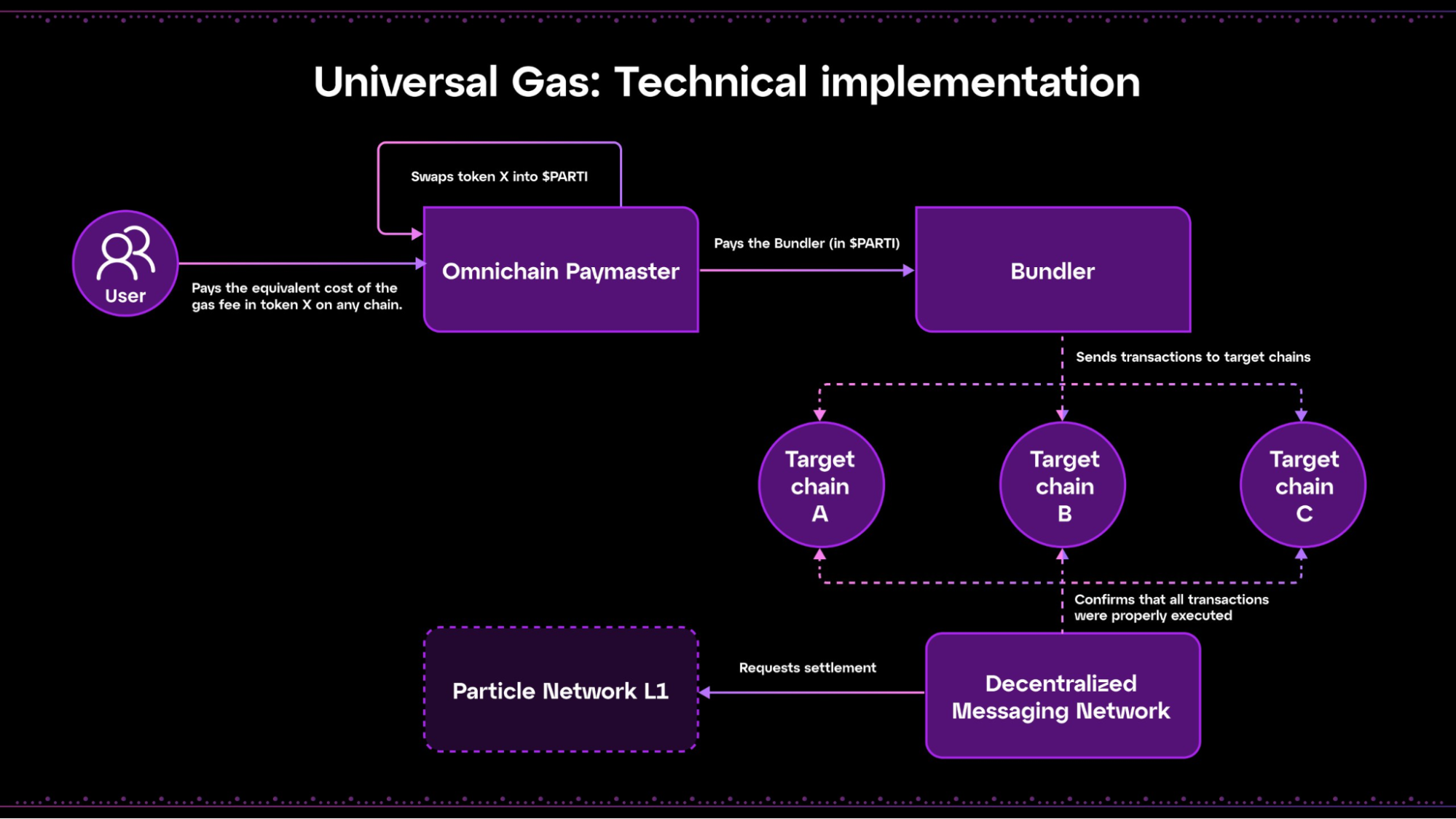 Universal Gas leverages Universal Liquidity and is implemented through an Omnichain Paymaster. Particle Network's native token, $PARTI, acts as a crucial exchange medium within this system, ultimately settling all gas fees in this token.
