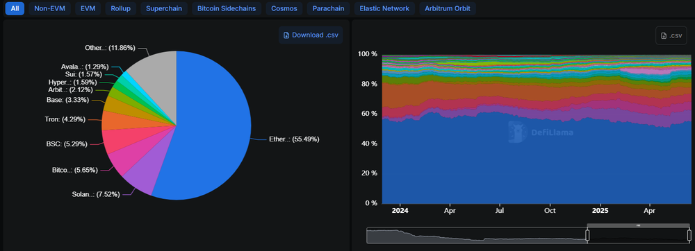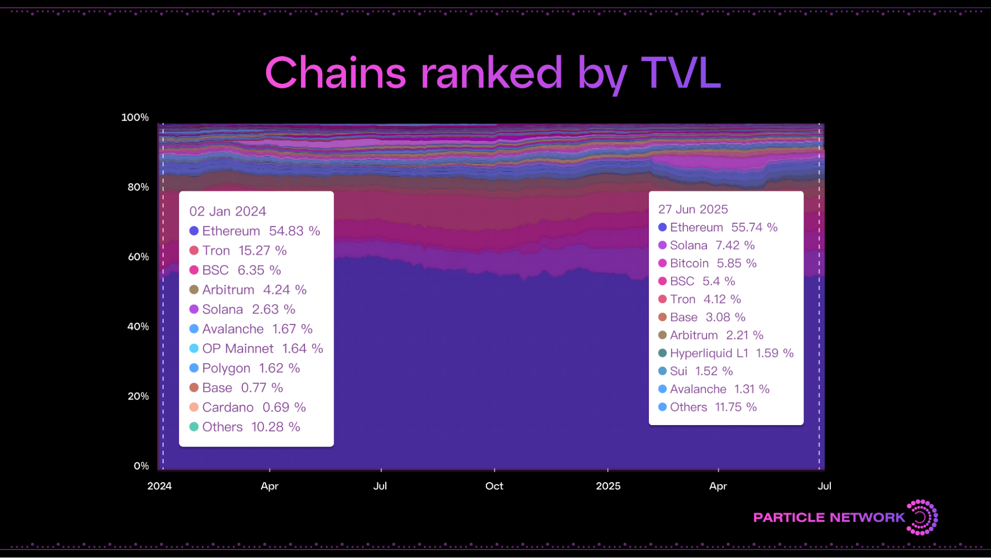- In 2024, the top 5 chains accounted for around 85% of the total TVL. In 2025, they only host 80%.