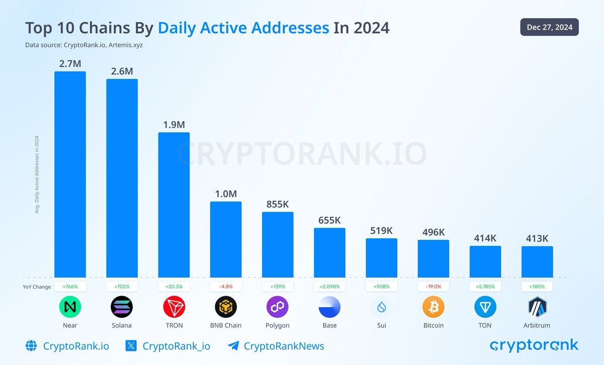 - NEAR Protocol: ~2.7 million daily active addresses (+766% year-on-year), the highest of any chain, driven by a handful of successful, gamified dApps.