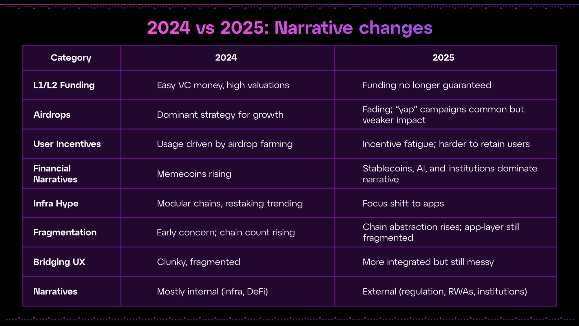 - Infra narratives (modular chains, restaking) had dominated the earlier part of the year.