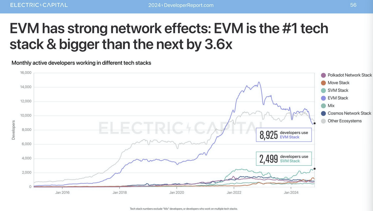- The EVM stack remains the richest in developers, with about 8,925 monthly active developers working on it. This includes the Ethereum L1 and its EVM L2s/sidechains. This developer base is roughly 3.6× the size of its nearest competitor.